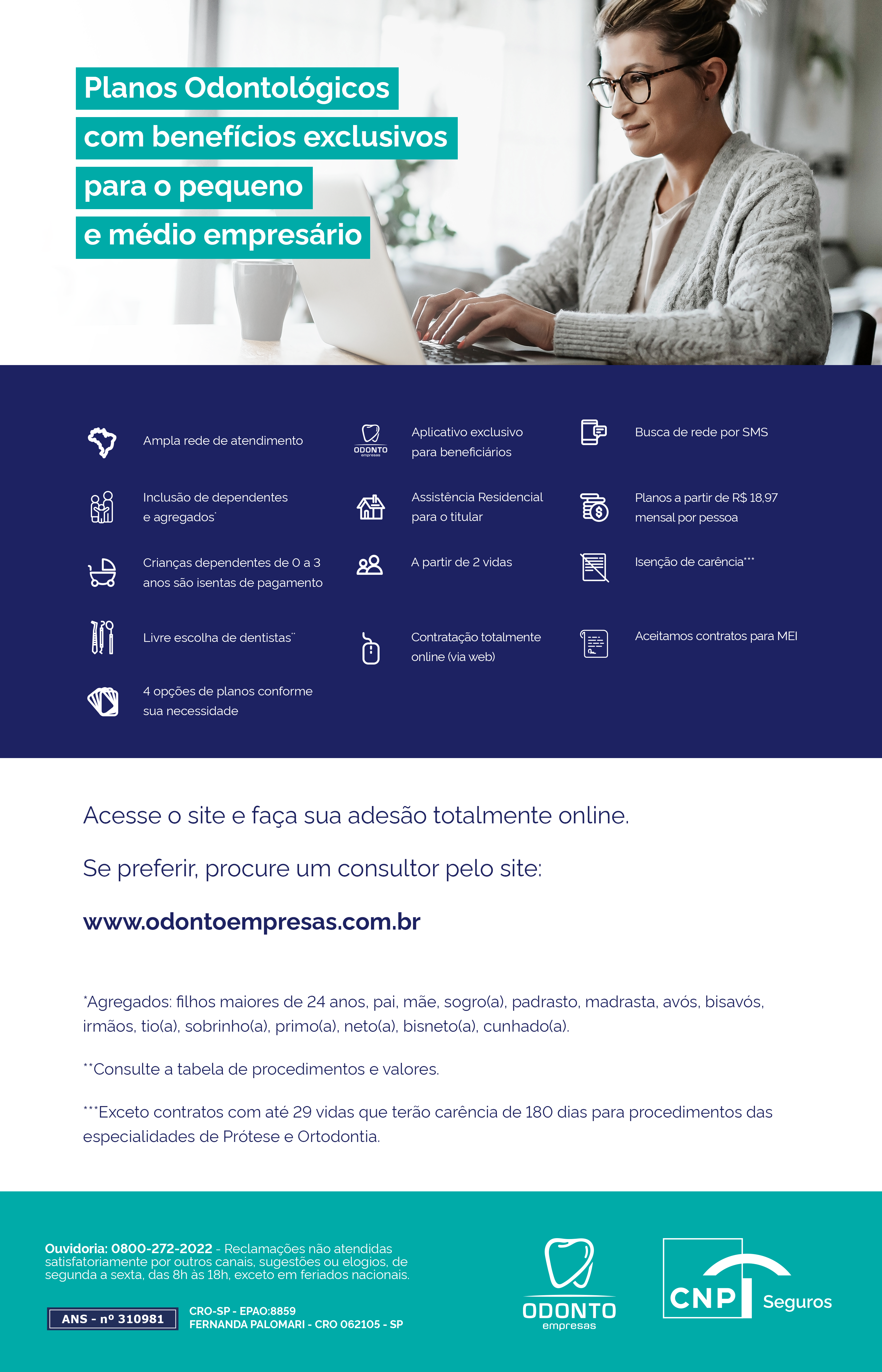 Odonto Empresas Convênios Dentários Ltda - CNPJ: 40.223.893/0001-59 - ANS n° 310981, CRO-SP - EPAO: 8859. RT: Fernanda Palomari - CRO/SP: 62.105